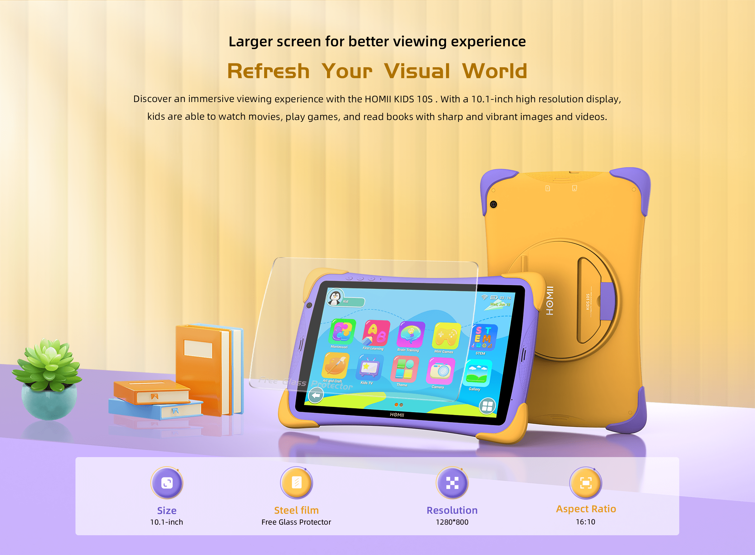 This Homii XBOOK kids10 tablet is equipped with an outstanding 6000mAh battery capacity that ensures your kids never stop learning as long as they are awake. Now, the power for your kids to become the best lies with the new Homii XBOOK kids10 kids Tablet.moments when they are trying to on a little adventure or exploration outside with friends.
