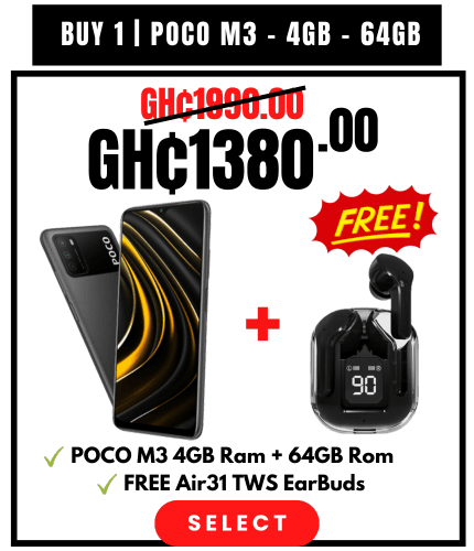 Buy 1: POCO M3 - 4GB/64GB Black for GH₵1,380 Get FREE Air31 Earbuds